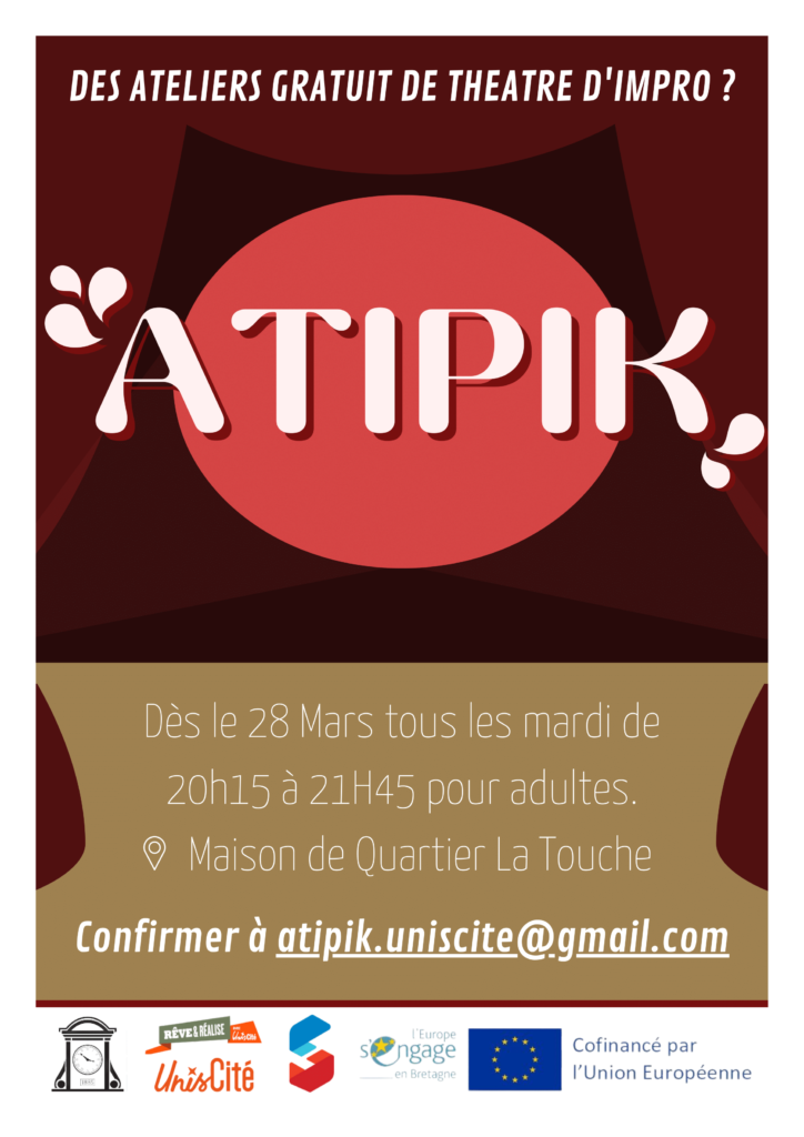 Tous Atipik – Ateliers de théâtre d’improvisation Tous les Mardis de 20h15 à 21h45, retrouvez Camille et Coline autour d’exercices d’expression verbale…stecy16 mars 2023